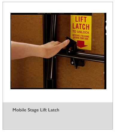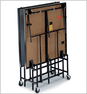 Opening the stage deck automatically lifts casters from the floor to prevent movement when the stage is in use. Integral drop-in couplings allow stages to be joined together.