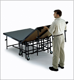 One person can roll Midwest Folding's mobile stages easily from storage to the event location.